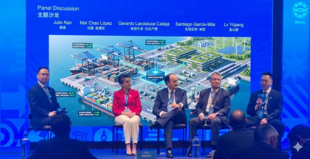 La mesa redonda, moderada por el Sr. Julio Nan, presidente de la Asociación Española de Chinos en el Exterior, reunió a representantes de primer nivel del sistema portuario español. En ella participaron la Sra. Mar Chao López, presidenta de la Autoridad Portuaria de Valencia; el Sr. Gerardo Landaluce Calleja, presidente de la Autoridad Portuaria de la Bahía de Algeciras; y el Sr. Santiago García-Milà, subdirector general de la Autoridad Portuaria de Barcelona, quienes compartieron proyectos, retos y perspectivas de futuro.