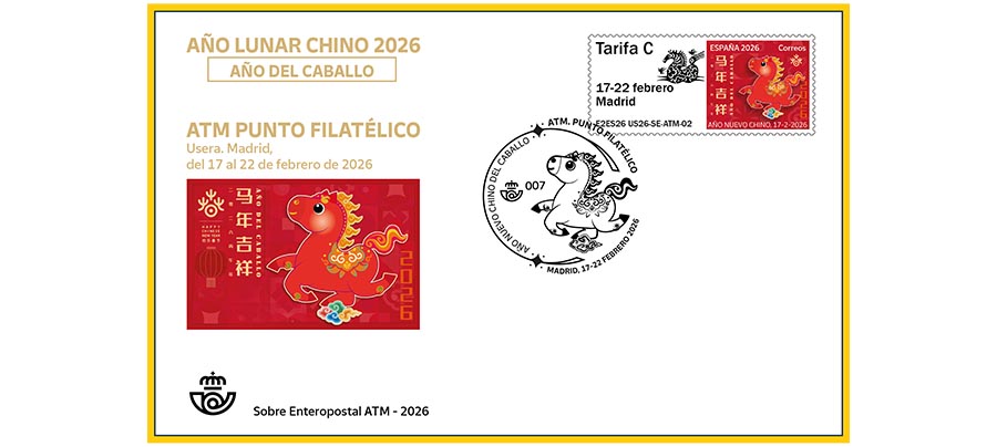 Un año más, Correos se ha sumado a las celebraciones del Año Nuevo Chino con la emisión de un sello con valor variable (ATM) y un sobre de primer día conmemorativos dedicados al Caballo de Fuego, protagonista del Año Nuevo chino 2026. Representa un período de acción, libertad, cambios, nuevas oportunidades y dinamismo, impulsado por la energía de este signo asociado a la sabiduría y la intuición.