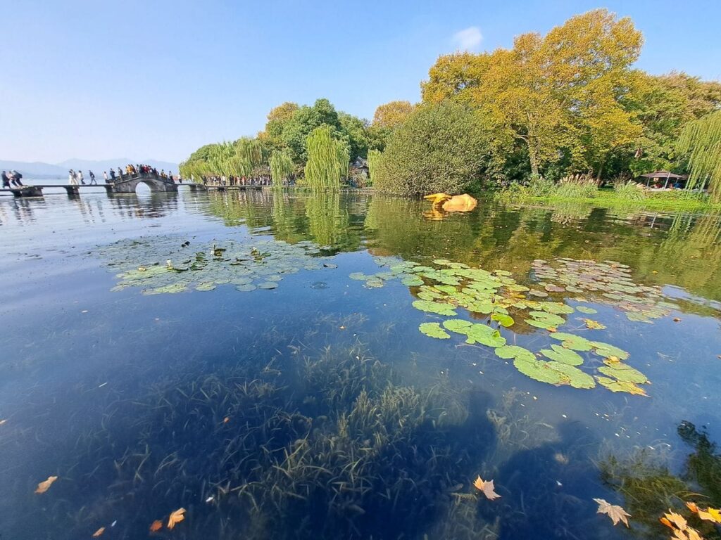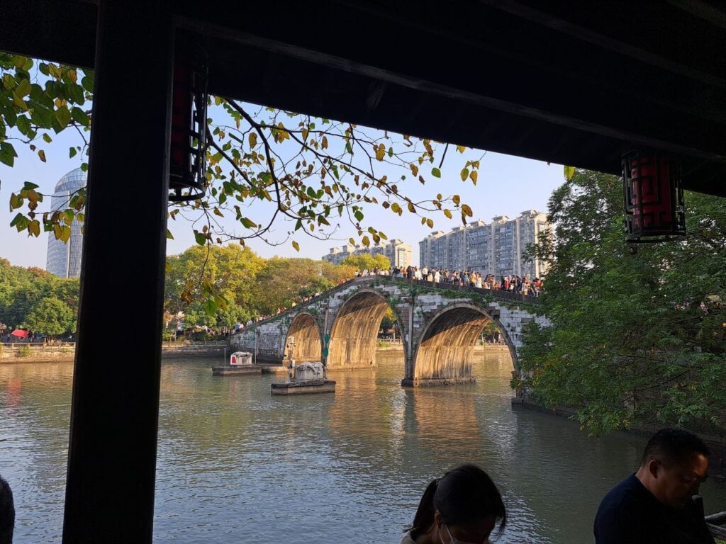 El sábado estuvo dedicado a explorar la historia y los monumentos de Hangzhou. Entramos en el Museo Nacional de la Seda, donde descubrimos antiguas prendas ropa de distintas dinastías, incluso se conservan fragmentos de épocas tan remotas como los Estados Combatientes. Una de las piezas más llamativas para mí fue la reconstrucción a tamaño real de un telar de seda de la dinastía Han. Después, nos ofrecieron tiempo libre para ver parte del Lago del Oeste, que fue durante cientos de años fuente inagotable de inspiración para poetas, artistas y pensadores chinos e incluso japoneses. Más tarde pasamos caminando por el tramo del Gran Canal que atraviesa Hangzhou. Esta obra monumental de la dinastía Sui fue eje esencial del desarrollo económico histórico de China y está inscrita como Patrimonio de la Humanidad en la UNESCO desde 2014.
