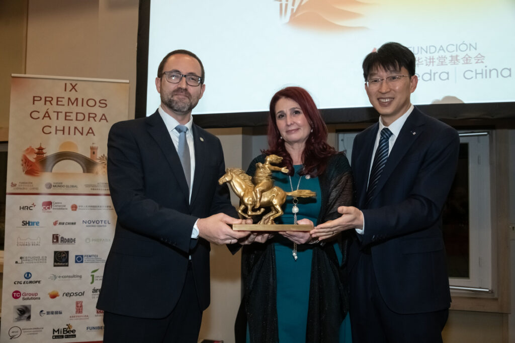 La patrona de la Fundación Cátedra China, Dong Deng, recibe un reconocimiento oficial de la mano del patrono Antonio Segura y el consejero político de la embajada de la República Popular China en España, Dai Xu. Foto: José Antonio Rojo.