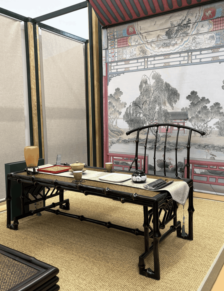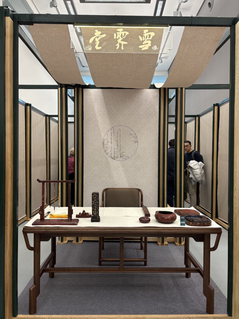 El recorrido continúa con la ‘Entrada al Estudio’. Algo único inspirado en la forma de un shujian -los antiguos rollos de escritura- y que adopta la apariencia de un libro que se despliega lentamente. Una imagen que recoge el tema central de la exposición y que da paso al ‘Pabellón del viento apacible’, un pequeño espacio que evoca la escena tradicional china de saborear el té en un jardín abierto y natural, donde la armonía y los finos juegos de té, que combinan belleza y funcionalidad, recrean el Pabellón sobre el Estanque Cuadrado del Palacio del Príncipe Gong.