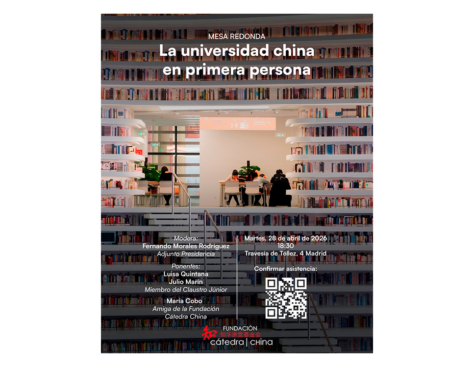 Este encuentro contará con la participación de Luisa Quintana y Julio Marín, miembros del Claustro Junior de la Fundación Cátedra China, y de María Cobo, amiga de la Fundación Cátedra China. La sesión estará moderada por el adjunto a la presidencia de la Fundación, Fernando Morales.