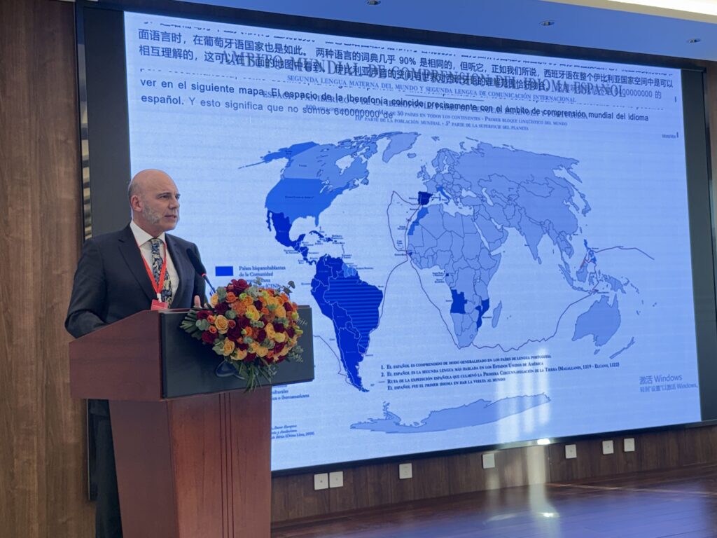 Una de las ponencias más relevantes fue la del decano de la Universidad de Lenguas Extranjeras de Beijing, Sr. Chang Fuliang, quien destacó el valor estratégico del aprendizaje de idiomas en la gobernanza global. Subrayó cómo el español y el portugués continúan ganando presencia como segundos idiomas entre los ciudadanos chinos, aunque aún queda un amplio margen de expansión. En línea con la visión del presidente Xi Jinping, el decano recalcó la importancia de una cooperación estrecha entre las tres grandes lenguas globales —chino, español y portugués— para avanzar hacia un sistema internacional más coordinado e inclusivo.