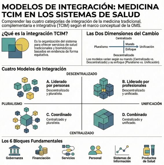 - Categoría D: Modelo Combinado (Centralizado y Unificado): La integración es un mandato estatal que busca crear un sistema de salud único donde la MTCI y la biomedicina están fundidas en todas las estructuras, desde la administración hasta la entrega de servicios.